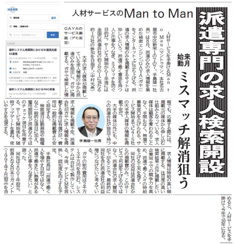 2021年7月6日発行の中部経済新聞にて、弊社が8月24日にリリースする派遣専門の求人検索エンジン「GAYA」についての記事が掲載されました。