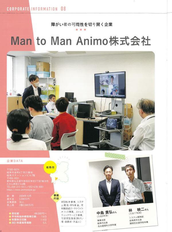岐阜大学の「地域産業と企業戦略入門:岐阜の企業を知る」の受講生24人が、岐阜県内の企業を訪問して取材し、その魅力を紹介するために作成した冊子「大学生が聞いた 岐阜の企業8選」(産学金官連携人材育成・定着プロジェクト推進協議会発行)にグループ企業のMan to Man Animo株式会社が掲載されました。