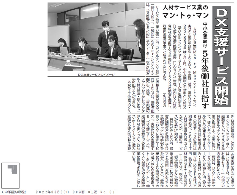 2022年6月29日発行の中部経済新聞にて、弊社が7月1日にリリースした、中小企業様向けのDXワンストップ伴走サービス「デジ革ご一緒サービス」についての記事が掲載されました。
