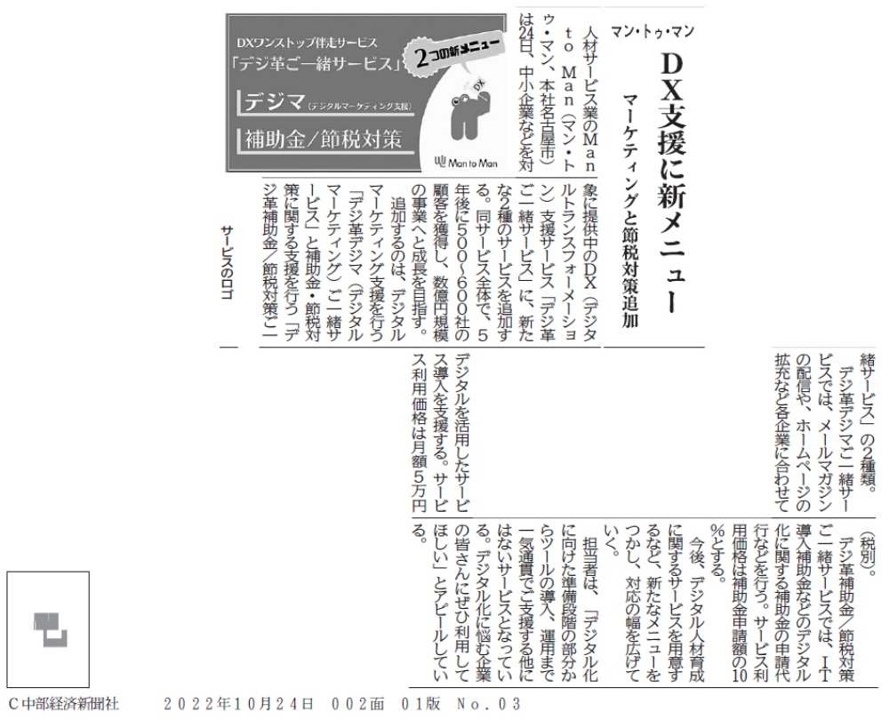 2022年10月24日発行の中部経済新聞にて、弊社が10月24日にリリースした、 デジタルトランスフォーメーション(DX)による事業改革を目指す中小企業様向けのDXワンストップ伴走サービス「デジ革ご一緒サービス」の追加新設サービスとして「デジ革デジマ(デジタルマーケティング)ご一緒サービス」および「デジ革補助金/節税対策ご一緒サービス」についての記事が掲載されました。